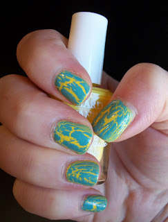 For this mani, I started with Hard Candy Splendid (wish I had taken pictures with it alone). Put it on last Wednesday and I LOVED it. It was not very easy to work with but most yellows aren't. I used four coats to get full coverage and let them dry between. It wasn't the fastest mani but worth it. The next day I covered it with China Glaze Crushed Candy and loved it even more. I never meant to wear it this long but that's what happens with a newborn. Luckily the wear has been minimal, zero chips nearly a week later. I used Gelous base coat and Poshe Top Coat on the yellow then Orly In a Snap over the crackle.